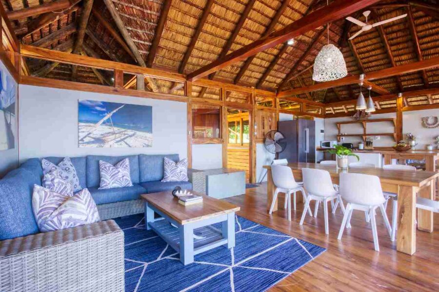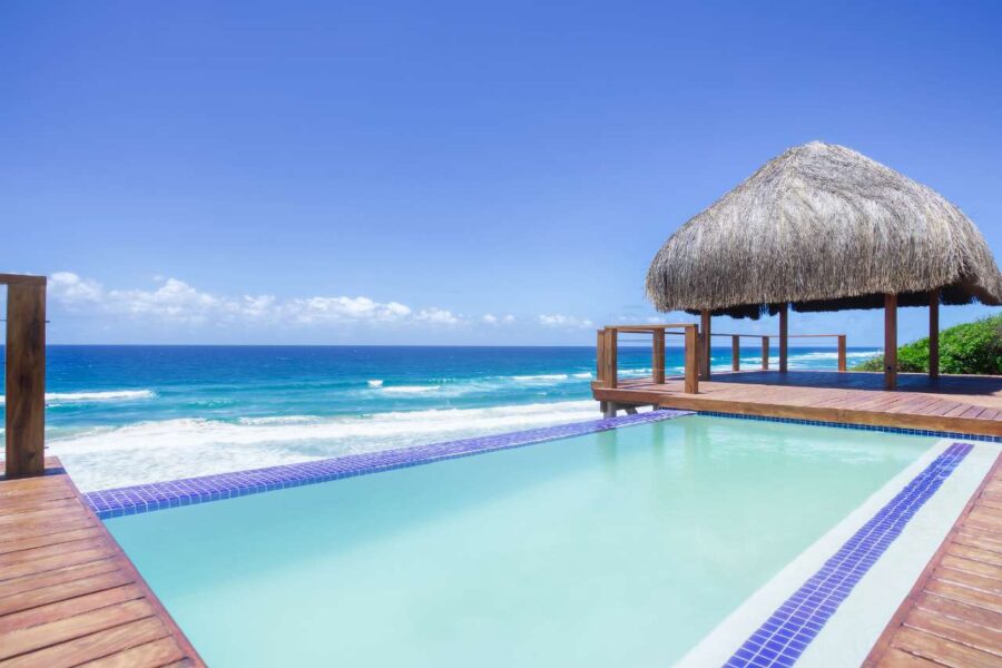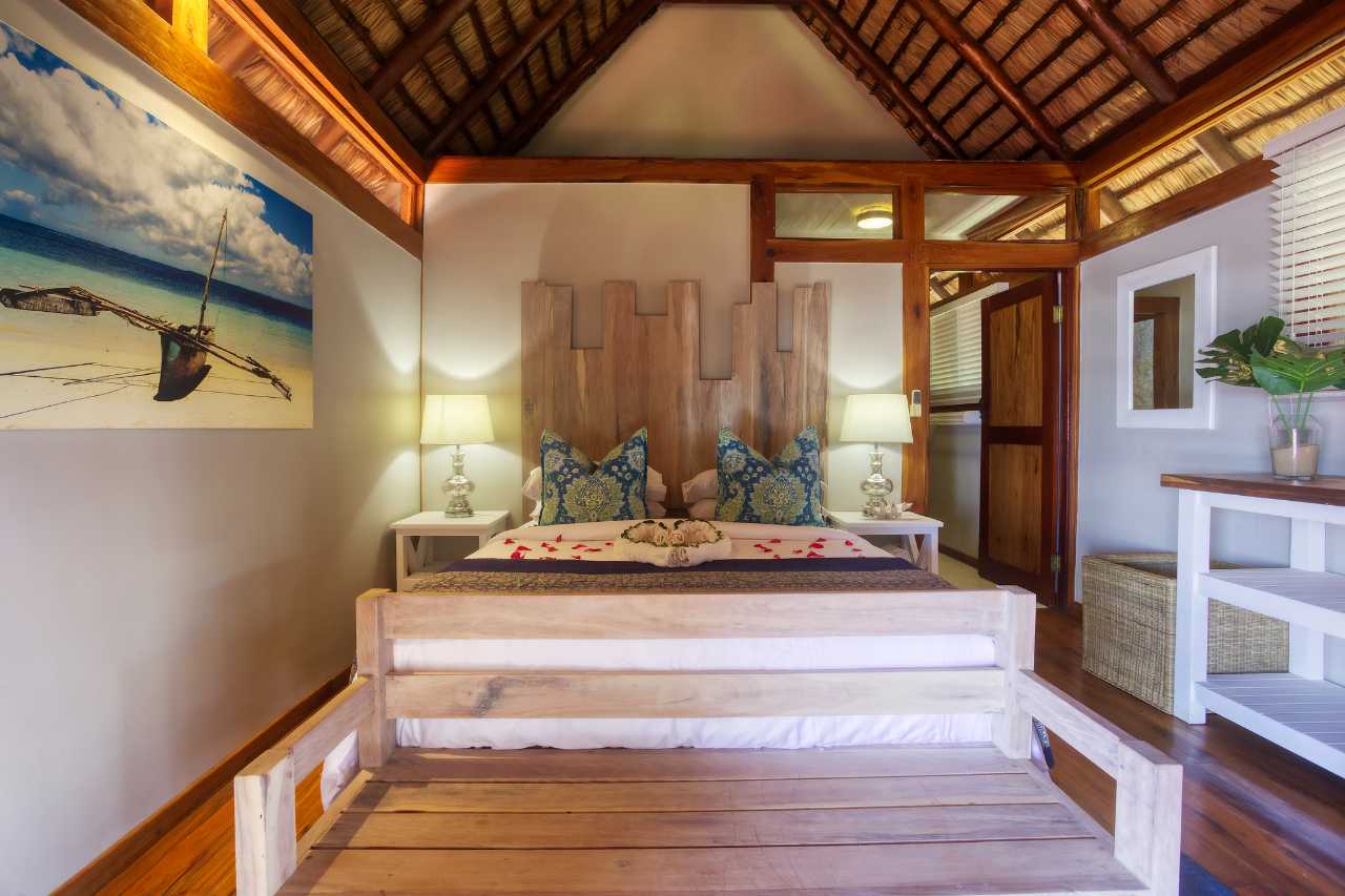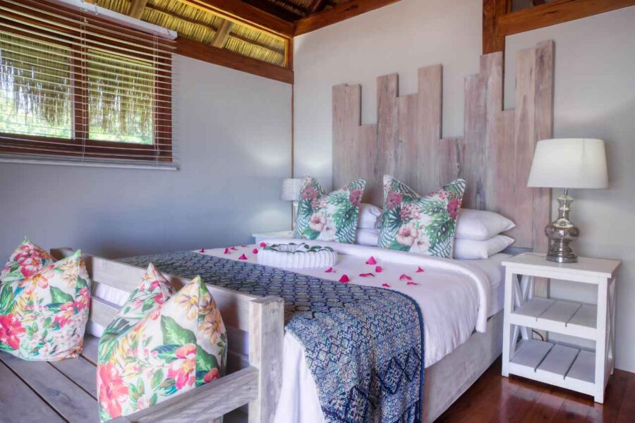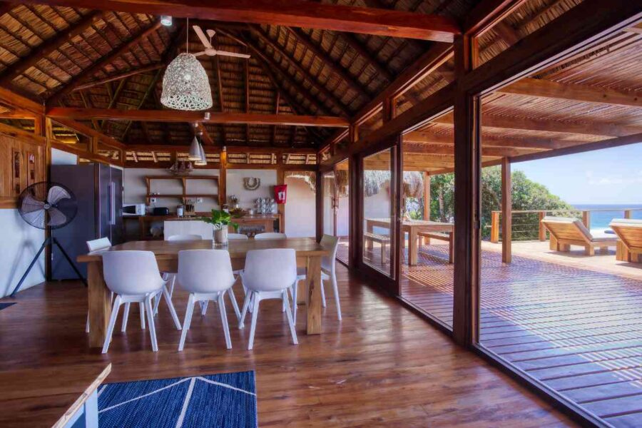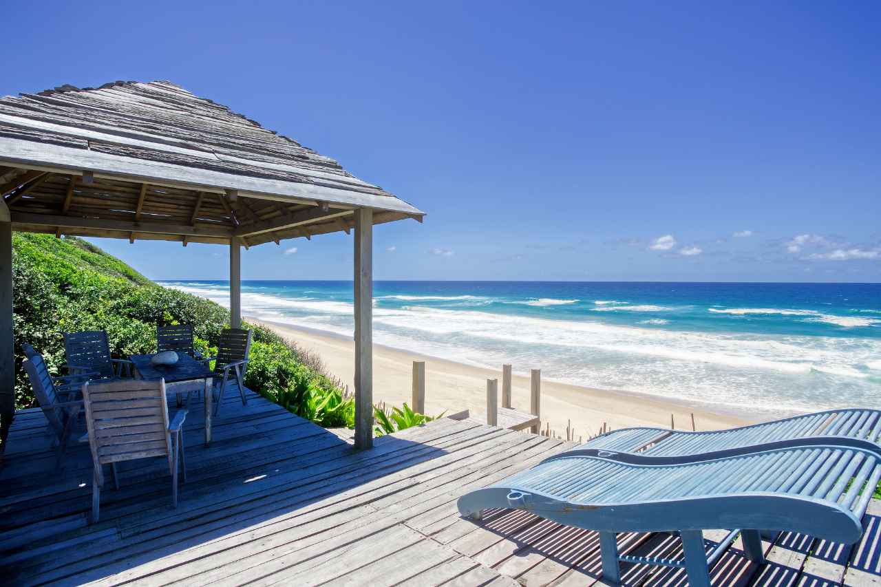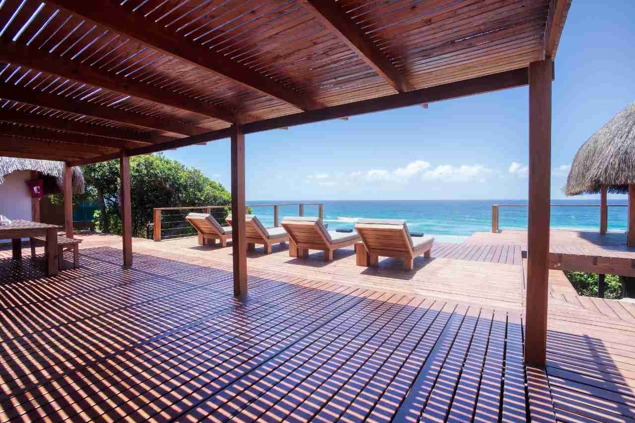 Aloha 1 is a luxury beachfront home in Aloha Estate, located about 40 minutes from the Kosi Bay border along a 4x4 sand road. Positioned in the front row, it offers a private pool and an elevated wooden walkway that leads directly to the beach, where a furnished gazebo provides shaded relaxation. The house features four en-suite bedrooms designed for privacy—two sea-facing rooms with queen beds and two garden-facing rooms each with a double and single bed—accommodating up to 10 guests. All rooms include ceiling fans, linen, and bath towels (guests should bring their own beach towels). A separate open-plan lounge, kitchen, and dining area overlooks the ocean, and the fully equipped kitchen includes a gas hob, fridge/freezer, microwave, and washing machine (no oven), with cleaning products provided. Outdoors, guests can enjoy the private swimming pool with loungers and a gas braai, noting that wood and charcoal are not permitted due to the thatched roof.