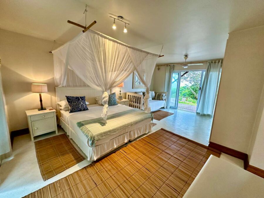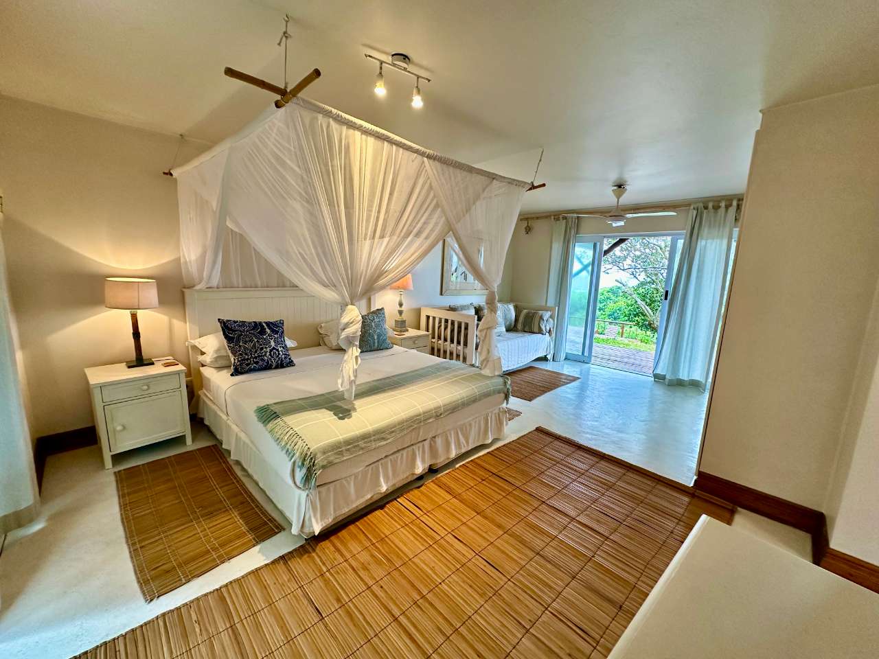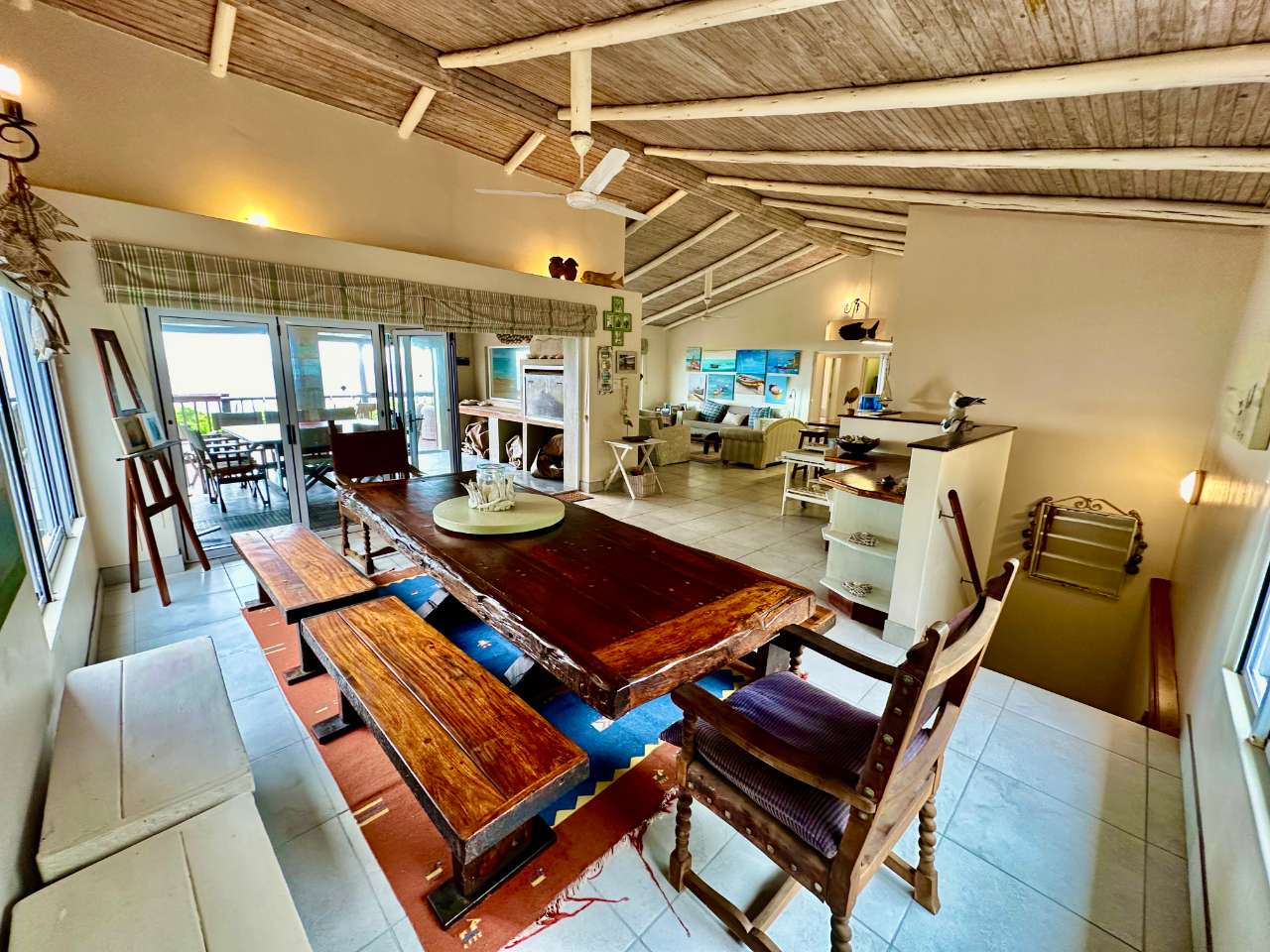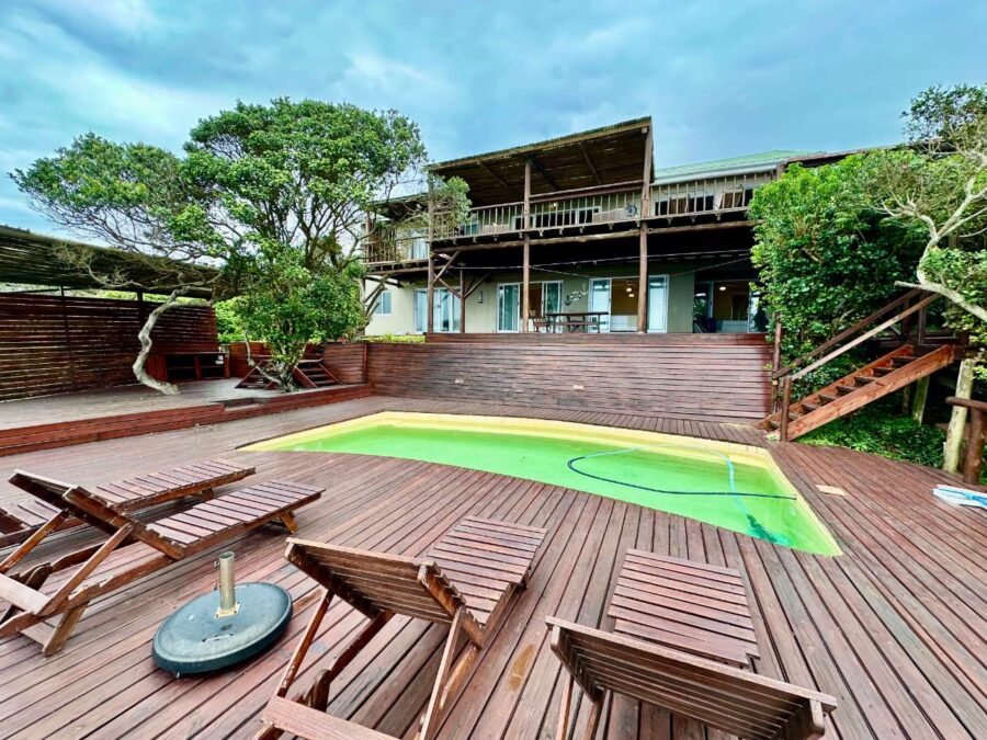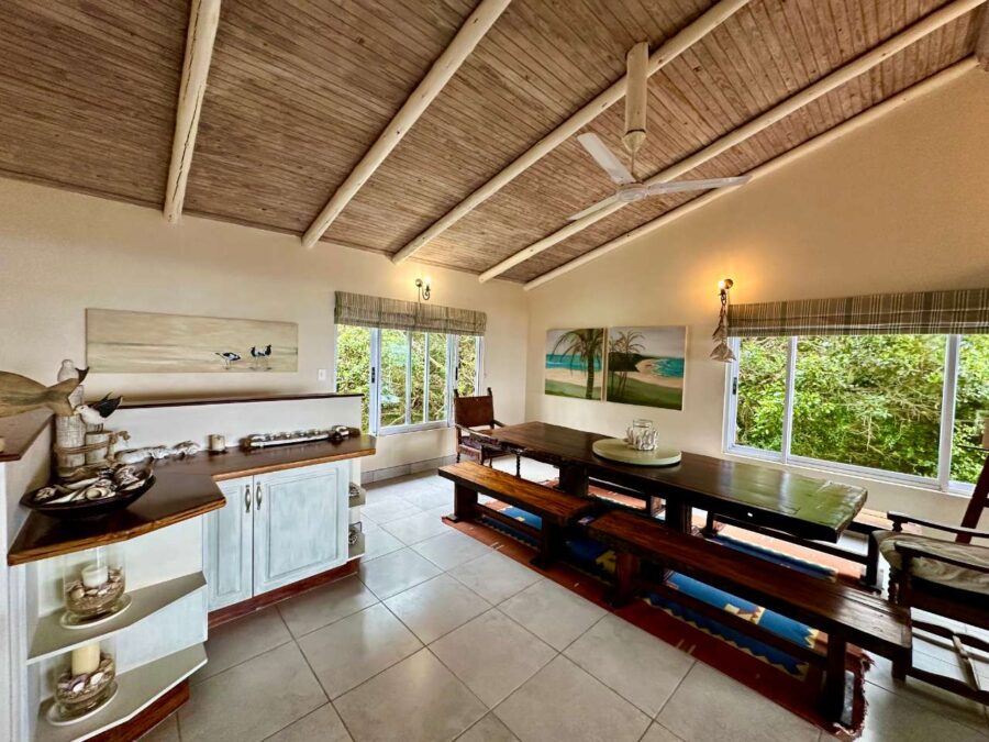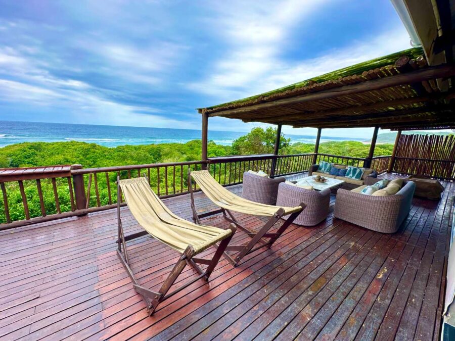 This spacious sea-view home sits on Ponta Malongane beach, just 30 minutes (16 km) by 4x4 from the Kosi Bay border, and comfortably sleeps 13 guests across five bedrooms with a mix of king, single, and en-suite configurations, most with mosquito nets and fans. Bedrooms include two king en-suites with showers, a three-single en-suite with shower, a four-single room with a separate bathroom, and a two-single en-suite with shower and bath. The upstairs living area offers a sitting room with TV/DStv and a large open-plan kitchen equipped with a gas stove, generous fridge/freezer space, coffee plunger, blender, microwave, and reverse osmosis water filter. Outdoor features include a deck with lounge seating and multiple braais (charcoal, gas, and Weber), plus a lower deck with a private pool and fire pit with log seating. Additional conveniences include undercover parking for three vehicles, shaded parking for two more, a generator with fuel, and all bedding, towels, cleaning materials, and toilet paper provided.