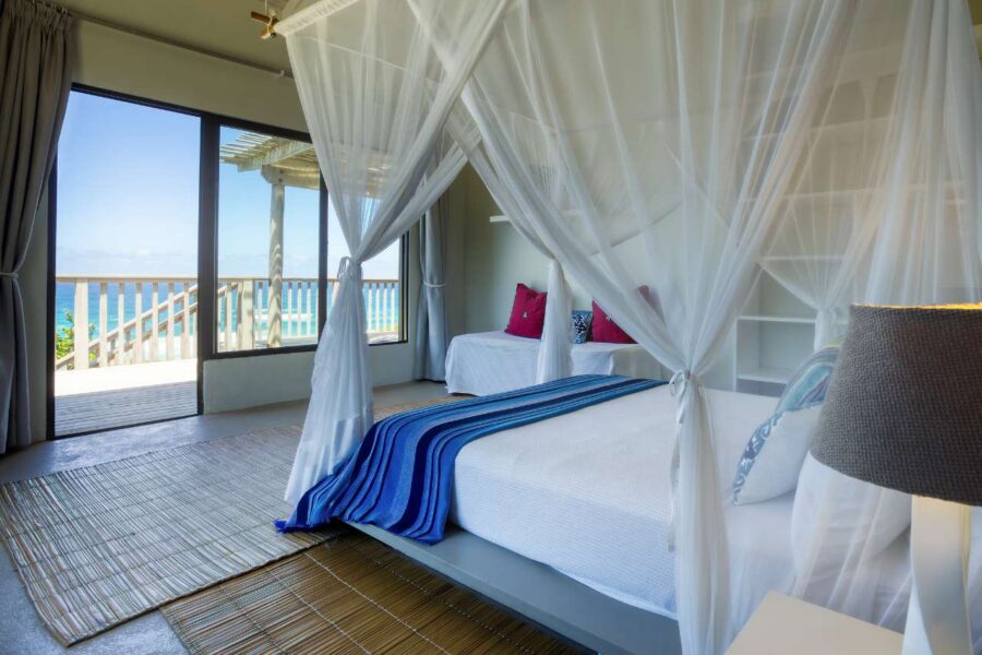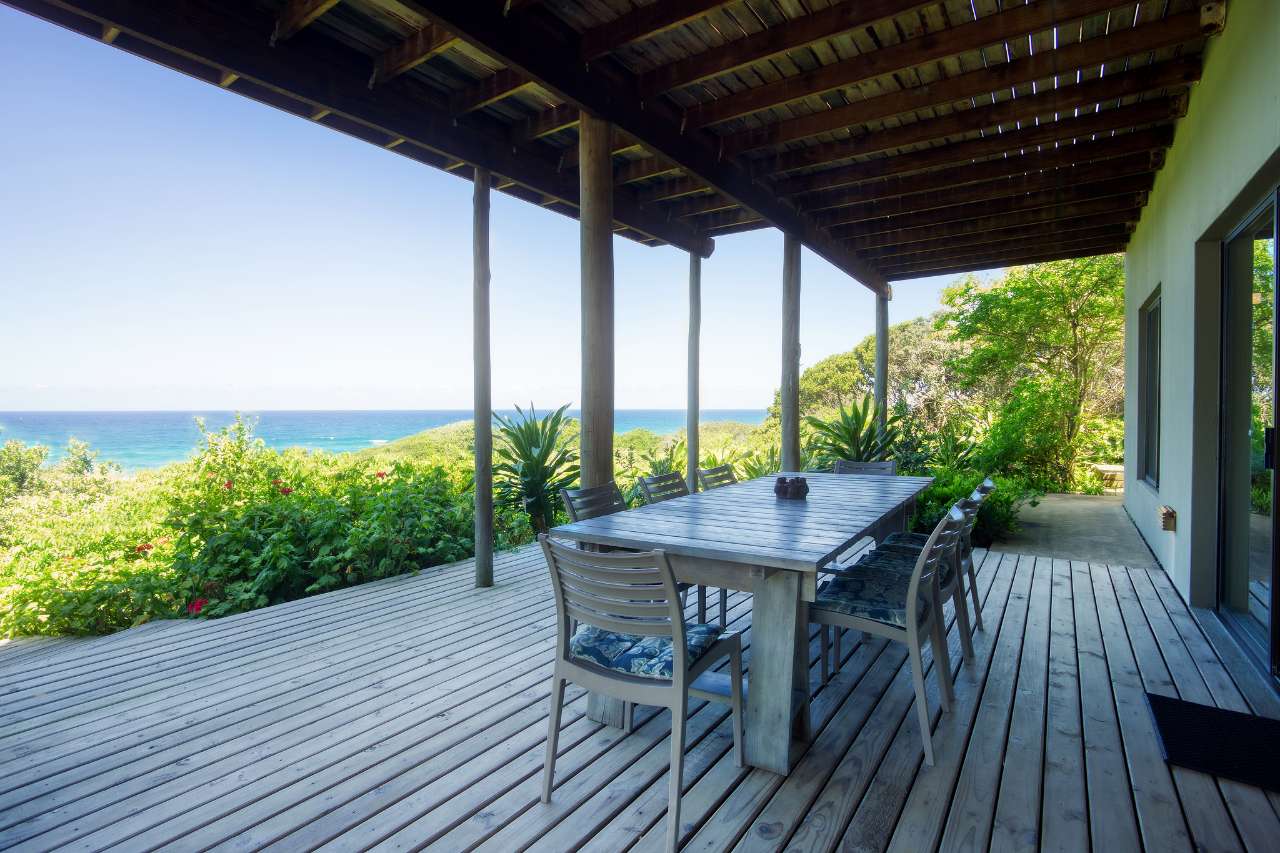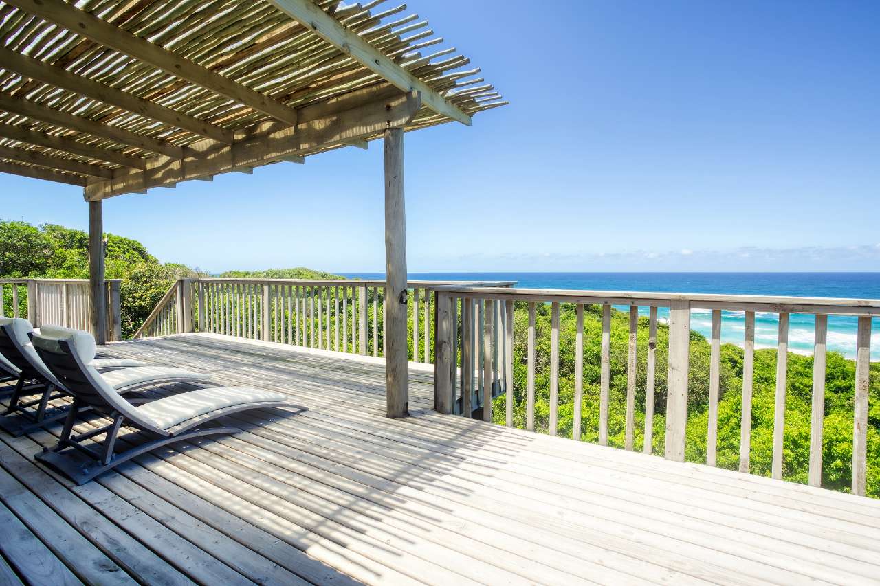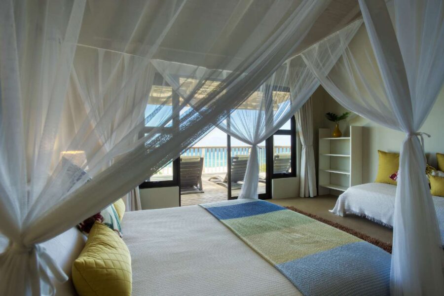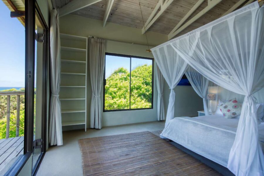 This gorgeous beachfront home in Kangela Estate, Ponta Malongane, offers direct access to the beach via a private wooden walkway. The downstairs area features an open-plan kitchen, lounge, and dining space leading onto a large deck with a Weber braai. The kitchen is fully equipped with a gas stove, oven, multiple fridges/freezers, and a coffee machine. All 4 bedrooms are upstairs, three with double beds and one kids' room with three single beds, sleeping up to 9 guests. Two rooms are en-suite, and the other two share a bathroom. All beds have mosquito nets and ceiling fans. The house includes a boma area, undercover parking for two cars, a washing machine, and an additional chest freezer. It is fully serviced and ideal for families, offering sea views, secure parking, and a relaxed beachside setting.